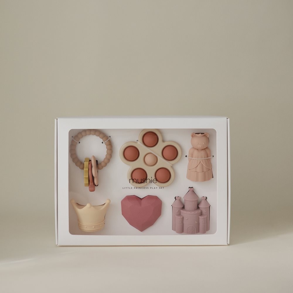 Ce Mushie Little Princess Play Set est un adorable cadeau d’inspiration princesse qui réunit trois essentiels ludiques, spécialement conçus pour les petites mains et les découvertes sensorielles.