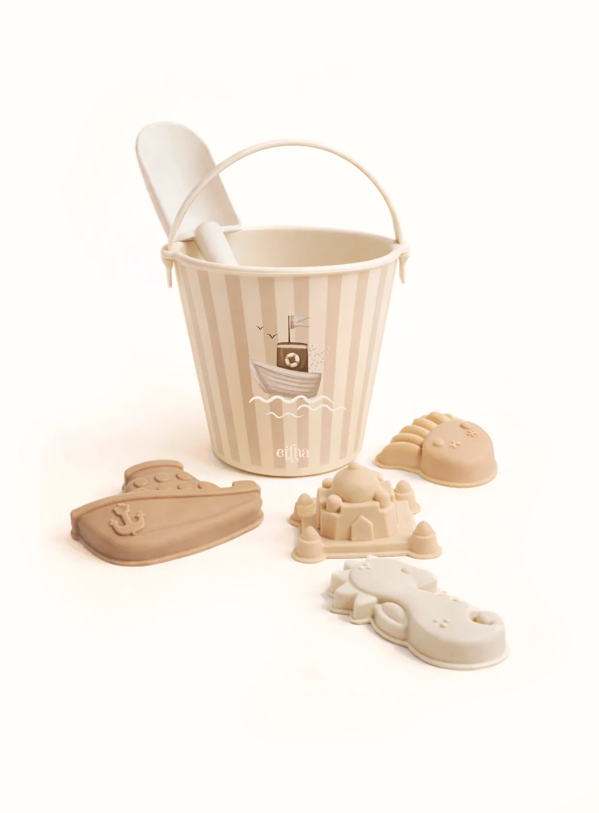 L’ensemble comprend un seau, une pelle assortie et des moules à sable en silicone, idéaux pour jouer sur la plage ou dans le bac à sable.