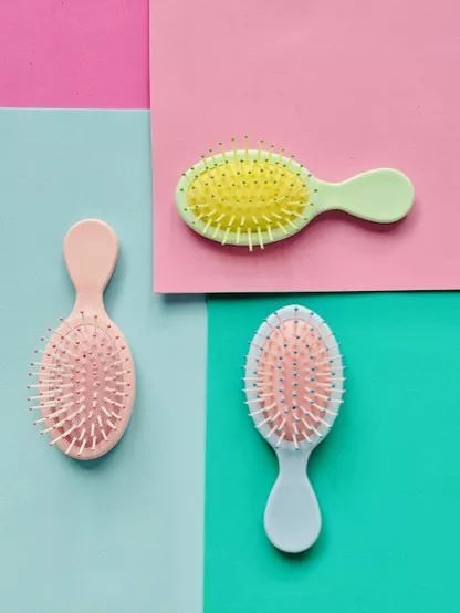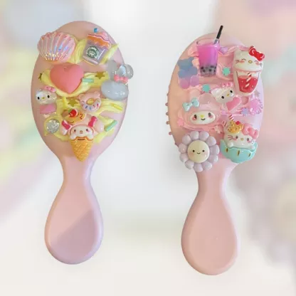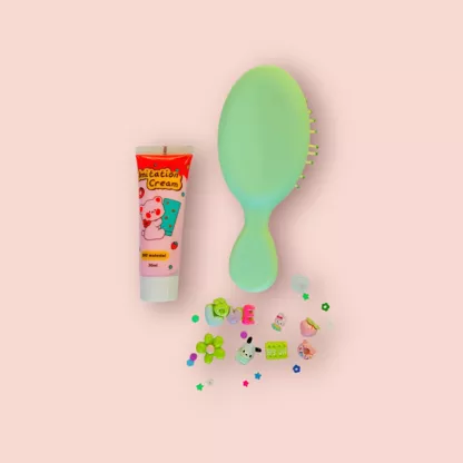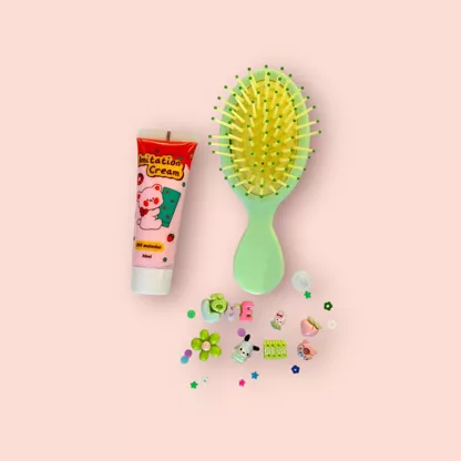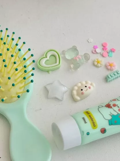 🌸 1 Mini brosse à cheveux – 1 Tube de colle crème – 1 douille – 5 Charms – 2 minis Charms – Toppings (confettis, mini coeur, paillettes)