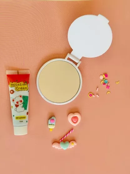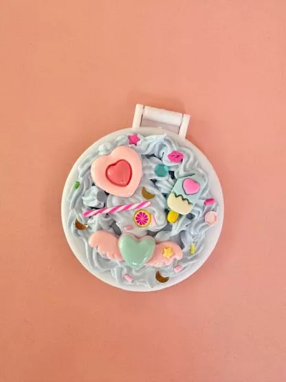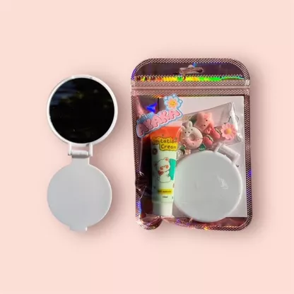 🌸 1 Petit miroir rond blanc – 1 Tube de colle crème – 1 Douille – 4 Charms – Toppings (confettis, mini coeur, paillettes)