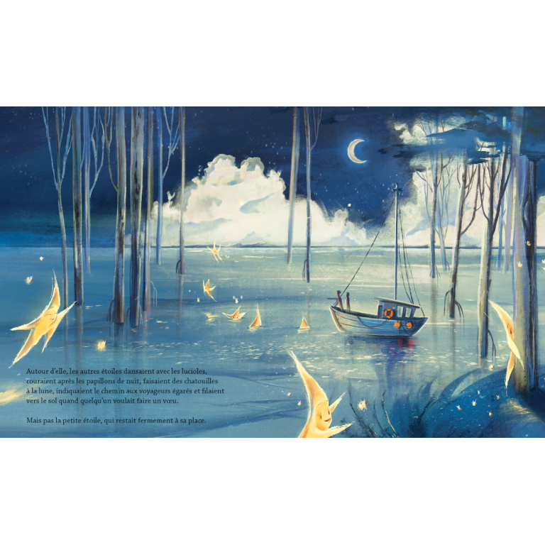 Dans un coin du ciel, au milieu de la Voie lactée, brillait une petite étoile. Chaque nuit, elle se réveillait, puis commençait à émettre sa lumière. Mais peu arrivaient à la voir, car la petite étoile ne quittait jamais son coin, à côté de sa maman. Autour d’elle, les autres étoiles dansaient avec les lucioles, couraient après les papillons de nuit, faisaient des chatouilles à la lune, indiquaient le chemin aux voyageurs égarés et filaient vers le sol quand quelqu’un voulait faire un voeu. Mais pas la petite étoile, qui restait fermement à sa place.