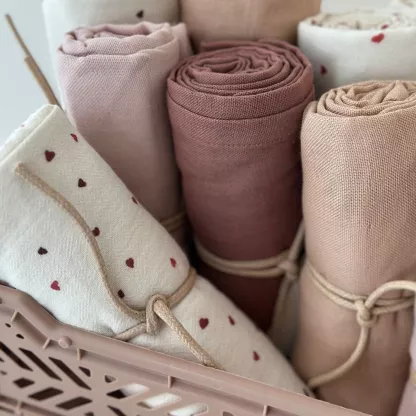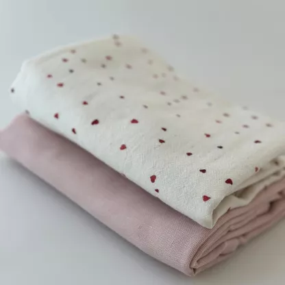 Le lange Coeurs est paré à toutes les bavouilles des bébés. Il peut servir de doudou, pour mettre sur l’épaule après le biberon ou la tétée, sur la table à langer ou encore en balade.