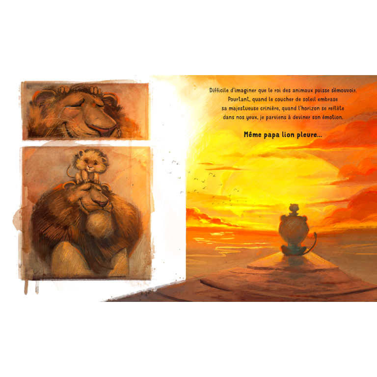Papa lion est si fort ! Et papa requin a des dents si acérées ! Difficile d’imaginer que, de temps en temps, eux aussi s’autorisent quelques larmes… Et pourtant, tous les papas pleurent, même s’ils sont forts comme des lions, piquants comme des hérissons, vigilants comme des hiboux et courageux comme des gorilles. Tous les papas ont un cœur rempli d’émotions, tout comme moi, tout comme toi !