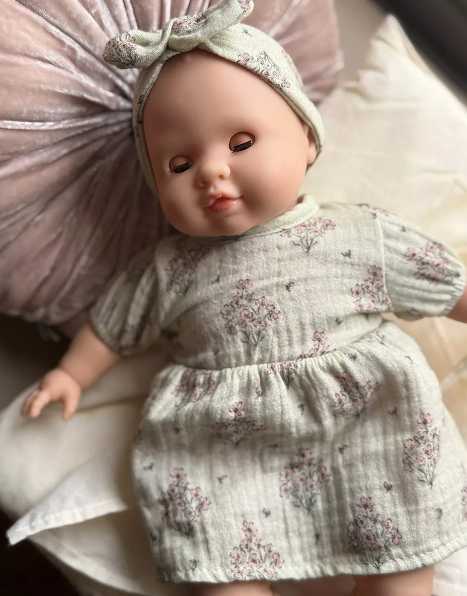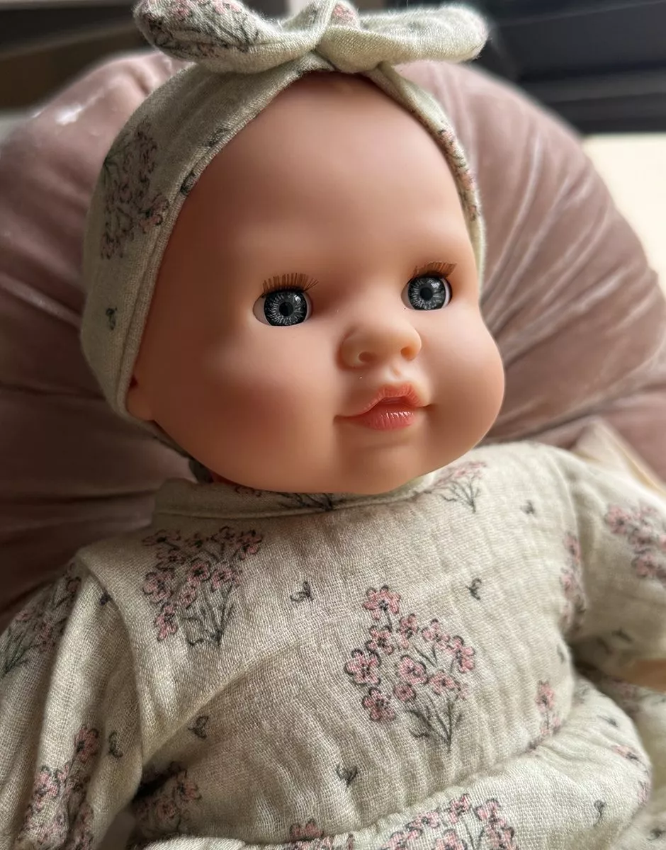 Émilie, poupée Cuties à corps mou et avec yeux dormeurs exclusive Minikane, vendue avec son ensemble robe Faustine et headband en gaze de coton.