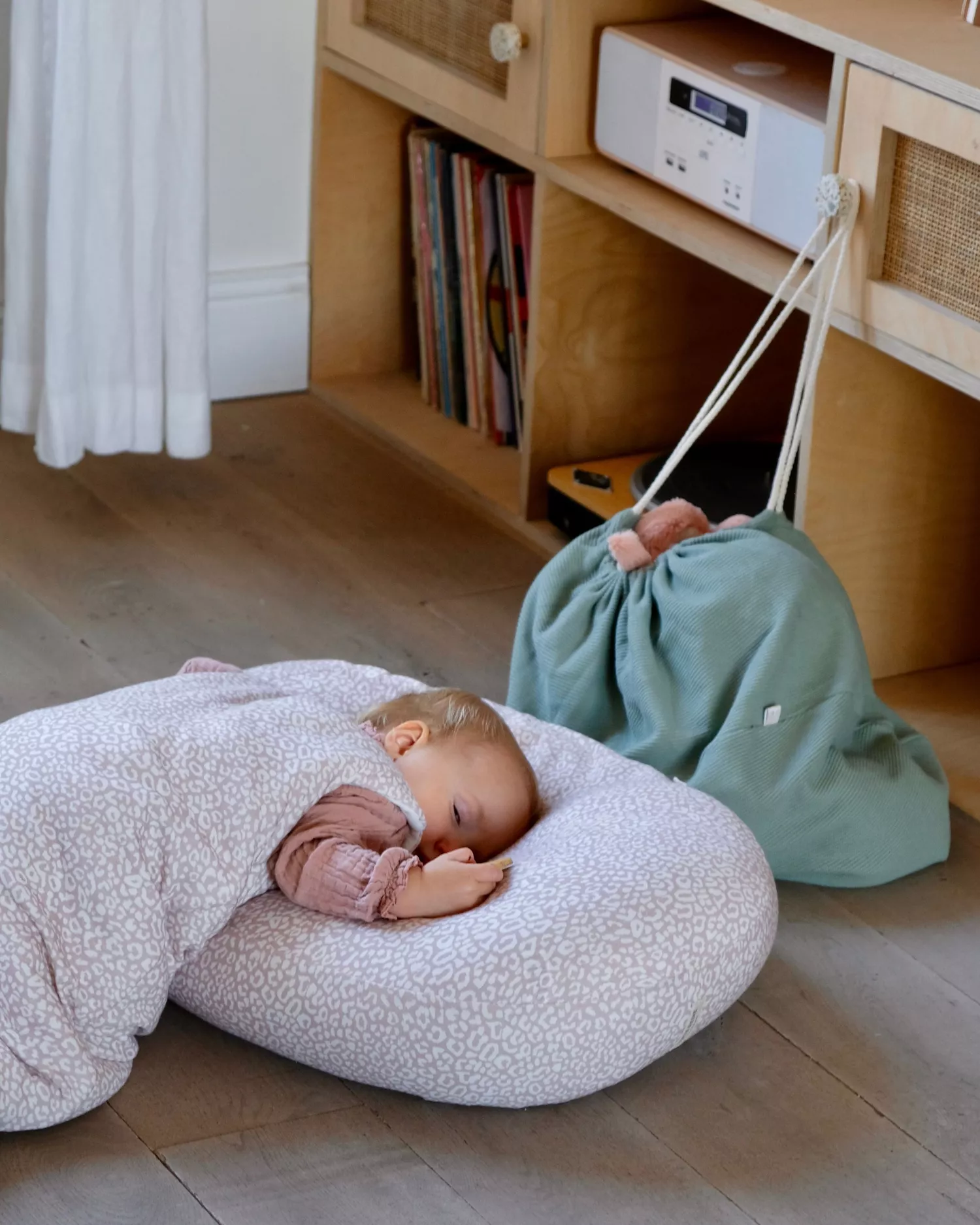 Grâce à sa corde, la housse s’adapte à tous les coussins (d’allaitement) et le transforme en nid douillet pour que votre bébé s’y love. Quand vous ne voulez plus l’utiliser en pouf, vous pouvez l’utiliser également en sac de rangement dans la chambre, ou à emporter n’importe où !