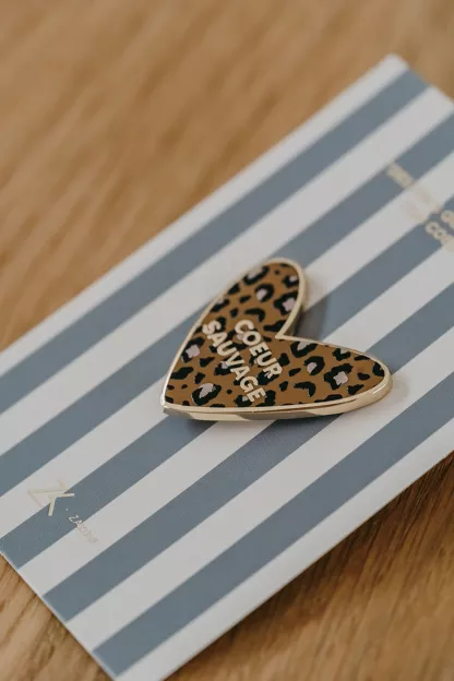 Notre pin’s « Sauvage » sera le petit bijou à épingler qui affirmera votre style avec audace et tendresse. Ce pin’s en forme de cœur arbore un motif léopard plein de caractère, rehaussé de l’inscription dorée « Cœur Sauvage ». Parfait pour personnaliser une veste, un sac, ou un tee-shirt… il apporte une touche unique et résolument moderne à chaque look.