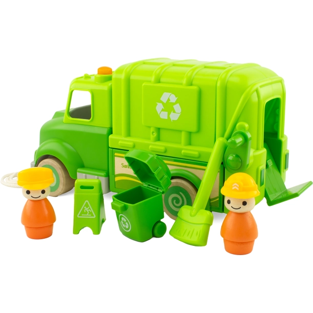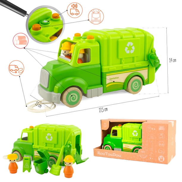 ⦁ Effets sonores et lumineux : appuie sur le bouton du camion pour entendre 3 sons différents (bruit de moteur, musique) et voir les gyrophares clignoter. ⦁ Accessoires inclus : livré avec une poubelle verte, un balai, un cône de signalisation et deux personnages en bois. ⦁ Fonction interactive : la manivelle permet de basculer la poubelle dans la benne, qui s’ouvre et se vide pour un réalisme total ! ⦁ Écoresponsable : emballage en carton kraft sans pelliculage plastique. Jouet adapté aux enfants dès 18 mois.