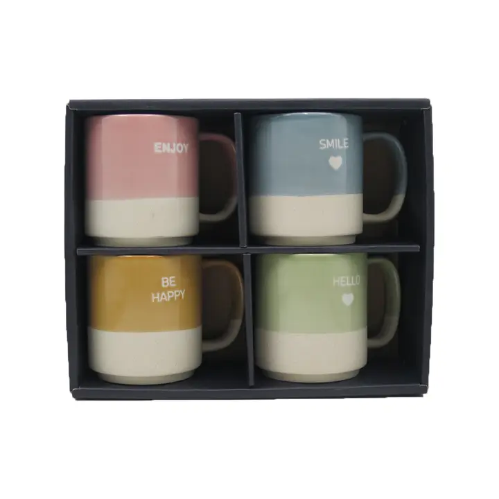 Set de 4 mugs en fine porcelaine aux teintes douces et naturelles (bleu, vert, rose poudré ocre)pour bien commencer la journée.