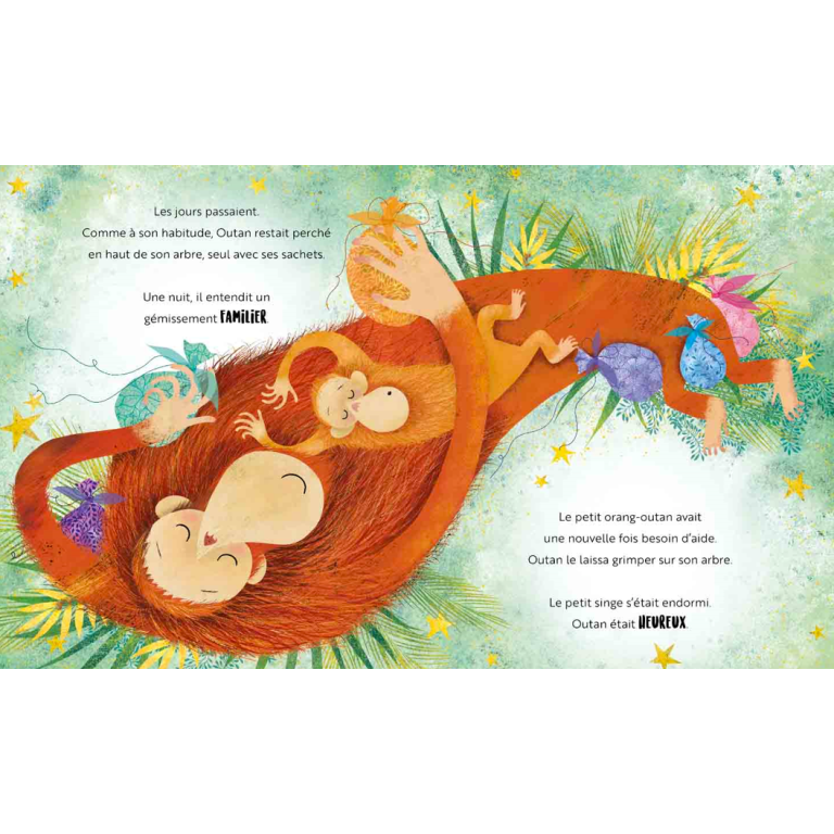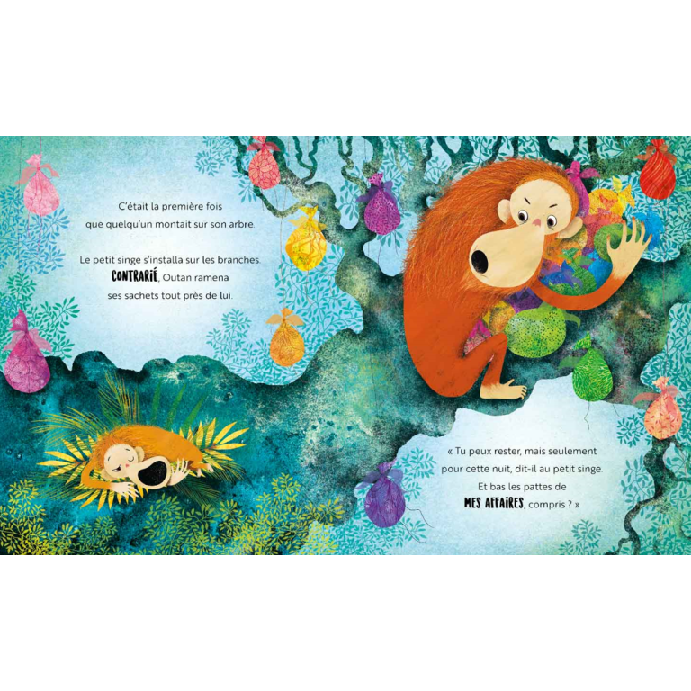 Orang-outan est très jaloux de ses affaires et ne laisse jamais personne s’en approcher. Jusqu’au jour où, grâce à l’amitié, il découvre que le partage est le plus beau des cadeaux.
