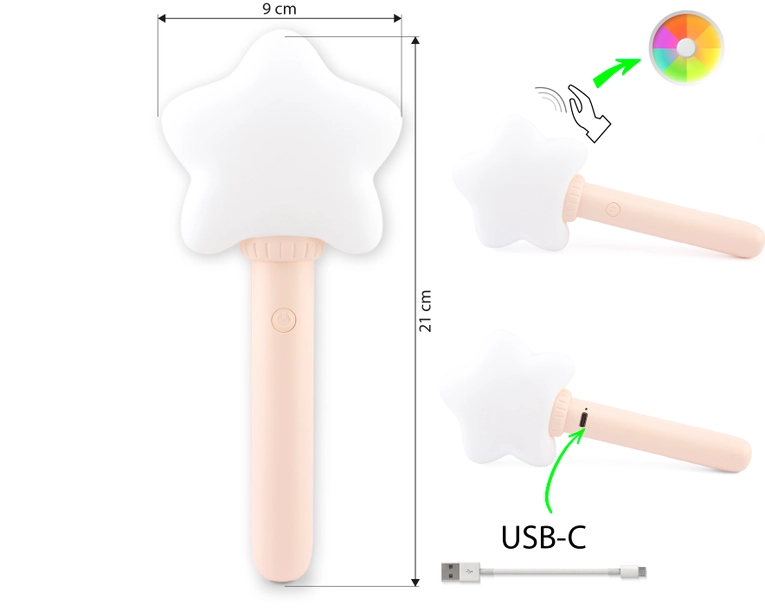 Baguette de fée lumineuse magique qui émerveille petits et grands avec son étoile douce en silicone souple et non toxique, sans phtalates et entièrement lavable. Lumière blanche fixe ou variation douce de 7 couleurs pour créer une ambiance féérique à chaque instant. Manche ergonomique contenant une batterie rechargeable, un bouton marche/arrêt discret et une prise USB pour une recharge facile et rapide.